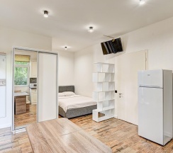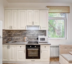 Есть апартаменты, которые оснащены плитой, можно приготовить пищу, двуспальная кровать, телевизор, wi fi, стиральная машинка, отдельный туалет, кондиционер, чистое постельное белье и можно сделать временную регистрацию бесплатно для Сочи это актуально