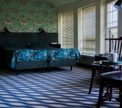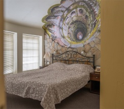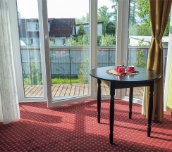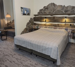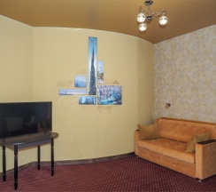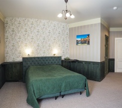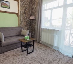 Двухкомнатный номер с двумя санузлами, душем и ванной с гидромассажем. Большая круглая кровать и диван. В каждой комнате стол и телевизор. Холодильник. Выход на собственную веранду.