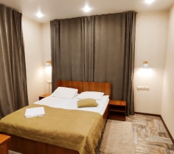 Новенький стильный отель, просторный номер из 2 комнат, в душевой кабине душ обыкновенный и душ тропический, вкусные завтраки, вежливый администратор, для любителей шашлыка мангал на улице. От центра города 5 минут по главной улице и 100м по так называемым садам. Очень понравилось!