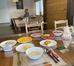 Останавливались в 23 номере с семьей. Чисто, тепло ( даже слишком), хороший ремонт, свежая постель, хороший тв с интернетом. Близко до бугельного подъемника и комната для снаряжения с сушкой это огромный плюс. Единственное, что расстроило это завтраки… уставший и недружелюбный персонал, который на любой вопрос остро реагирует. Хлеб старый, невкусный, омлет если хватило, то дадут, не успел твои проблемы… посоветуют раньше вставать. Просили пожарить яичницу за дополнительную плату , грубо отказали. Единственное, что действительно вкусный кофе. Вообщем видно, что на завтраках сильно пытаются экономить. Может лучше тогда делать за дополнительную плату, но на достойном уровне. Надеемся, что услышат критику и будут только расти в сервисе, потому что видно сколько вложено сил и средств и хочется, чтобы бизнес приносил доход владельцам и комфорт гостям!