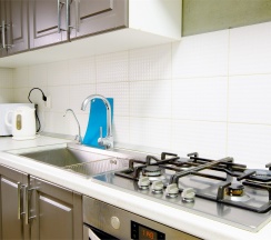 В этом доме кухня общая. Можете приготовить кушать. Есть холодильник, микроволновка. В шкафу лежат тапочки.
