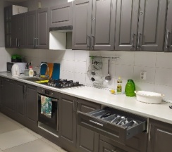 В этом доме кухня общая. Можете приготовить кушать. Есть холодильник, микроволновка. В шкафу лежат тапочки.