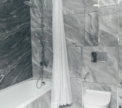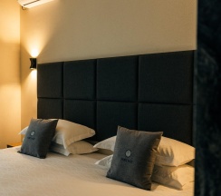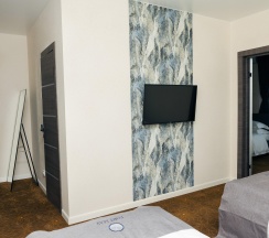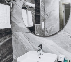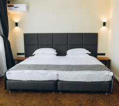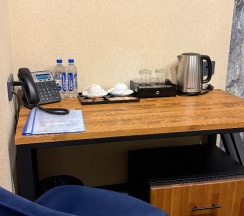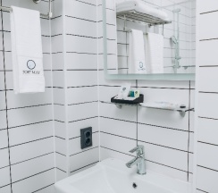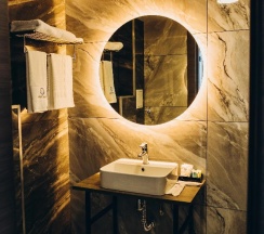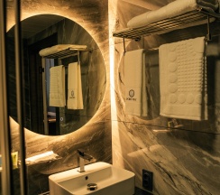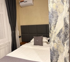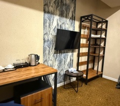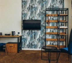 Номера уютные, в современном минималистичном дизайне, есть всё необходимое- ванные и туалетные принадлежности, швейный набор, салфетки, чай, кофе, посуда, халат, тапочки, полотенца, фен, холодильник.