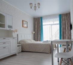 Просторный элегантный номер состоит из гостиной и двумя спальни. В гостиной расположен диван для отдыха с дополнительным спальным местом. В каждом номере есть уютная кухонная зона с набором посуды.