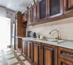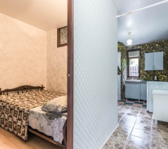 Небольшая кухня, чайник, холодильник, раковина. Ванна и туалет.