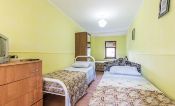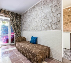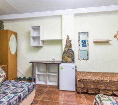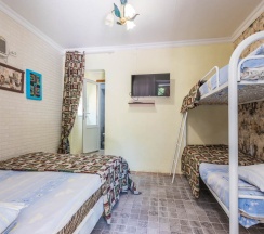 Двуспальная кровать, односпальный диван, телевизор, кондиционер, душ и туалет общий на 2 номера, холодильник на 3 номера.