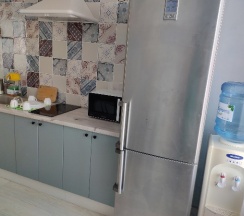 Есть кухня, где можно приготовить, или покушать то, что заказали доставкой. Есть и чай и кофе и все необходимые приборы.