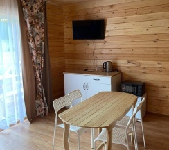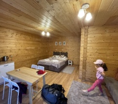Понравилось месторасположение базы и человеческое отношение администратора и директора. Показали номер,все принесли на доп. место. На вторые сутки не было свободных мест,но потом кто-то отказался от брони и на следующий день нас переселили. В домиках уютно и чисто, ужин принесли в номер. Для нас важно чтобы горячей воды хватило на всех проживающих в домике за это жирный +. Очень обрадовались,что здесь есть кафе и завтраки включены в стоимость,так как иногда нам приходится самими ходить и готовить,хотя мы приехали отдыхать. Еще здесь прекрасная баня, все чисто ,комплимент-чай,мёд и сушки! Есть небольшая детская площадка +. За территорией протекает река,можно прогуляться.