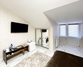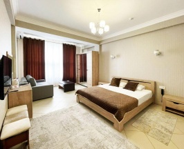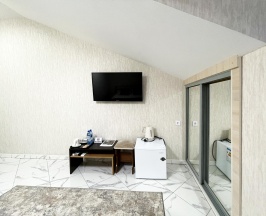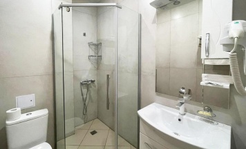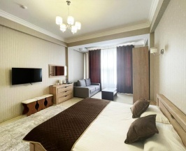Номер может быть рассчитан на трехместное размещение, в номере кроме двухспальной кровати имеется диван-кровать, номер также оснащен душевой кабиной, в номере: гардероб, рабочий стол, телевизор, холодильник, электрический чайник, санитарно-гигиенические принадлежности, фен.