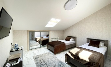 Просторный двухкомнатный номер, рассчитанный на четырехместное размещение, в спальне имеется большая двухспальная кровать, телевизор и гардероб, в комнате расположен большой диван-кровать, телевизор, рабочий стол, холодильник, электрический чайник, сан узел оснащен душевой кабиной и всеми необходимыми принадлежностями