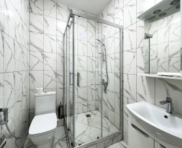 Двухместный номер с большой двухспальной кроватью и душевой кабиной, в номере: гардероб, рабочий стол, телевизор, холодильник, электрический чайник, санитарно-гигиенические принадлежности, фен