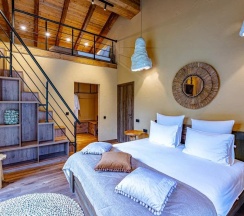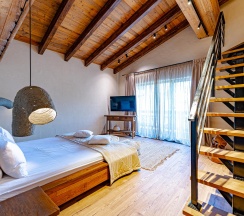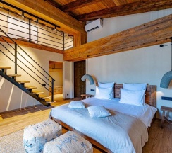 - 1 двухъярусная спальня (2 большие двухспальные кровати с одной ванной комнатой, гардеробной и балконом);