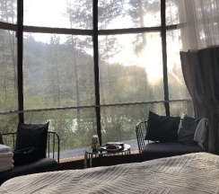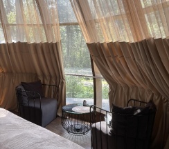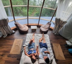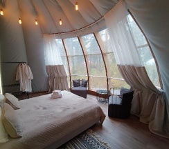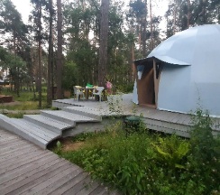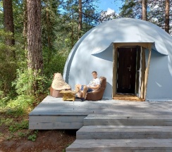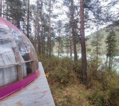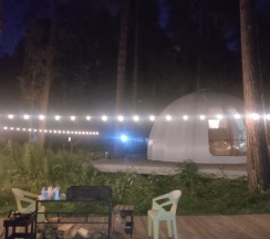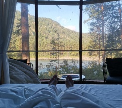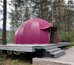 Купола расположены в сосновом лесу, прямо у реки. Утром просыпаешься от пения птиц, вокруг — тишина, горный свежайший воздух, чистота и покой. Очень красиво и ухоженно, далеко от дороги — идеально для тех, кто хочет отдохнуть от суеты и перезагрузиться.