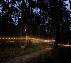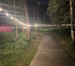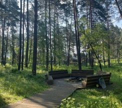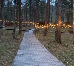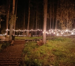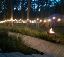 На территории гирляндовая подсветка, создает уютную атмосферу вечером. И есть костровище с деревянными лавками.