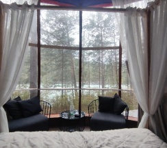 Из некоторых домиков открывается вид на лес, из некоторых на реку.