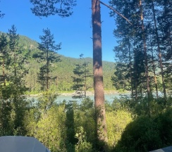 База находится в лесу, вся утопает в зелени, стоит прямо на берегу Катуни, с территории базы есть лестница - спуск к реке! Это огромное преимущество - ты можешь наслаждаться видом на Катунь без посторонних людей, не живущих на базе!