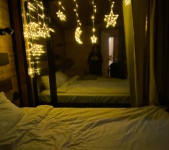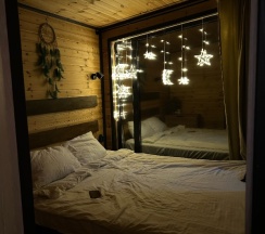 Отдыхали с 15 на 16 марта, дом "Ближе к звёздам". Встретили радушно и доброжелательно. Домик полностью соответствует фотографиям. Уютный, чистый, есть всё необходимое. Тёплый пол, так же был дополнительно обогреватель, но нам не понадобился. Полотенца, халаты для купания в чане, обувь (сапожки и кроксы) всё предоставили. Мангал, решётка, шампура. Чан чистый, вода прекрасная, растоплен шикарно. Вокруг лес, небольшое озеро, тишина, поют птички. Очаровательные котики скрасили наш досуг и помогли осилить шашлык) Ехали за спокойной атмосферой, релаксом, отдохнуть от города, насладиться красивыми видами - все задачи реализовали! Летом можно прогуляться и в лес, и до пляжа. Но мартовский дождь не дал нам возможностей для прогулок. Хотелось бы ещё раз вернуться летом. Спасибо за прекрасный отдых!