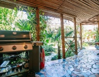 На первом этаже просторная общая кухня для приготовления пищи, газовая плита, тостер, чайник. Поесть можно как внутри, так и снаружи на веранде. Посуды хватало, тарелки классные.