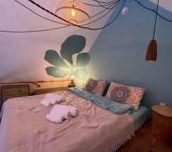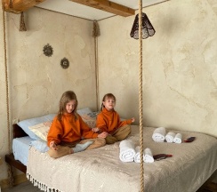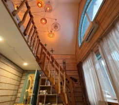 2 этажа, очень тепло и стильно, гостиная и душевая комната со всем необходимым, а на втором этаже удобная кровать в виде гнезда и оригинальное освещение, вообще очень много оригинальных деталей, привезены из Тибета и Индии🧘♂️
