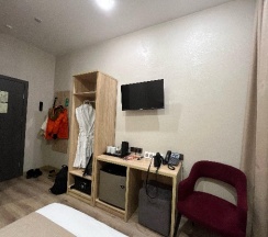 Очень классный отель, хоть и маленький. Все красиво, в номере чисто, все как на фото. Номер небольшой, но очень уютный. В номере шкаф, кровать, тумбочки, столик журнальный, холодильник, микроволновка, кондер, стулья, зеркало, чайный набор, чай кофе сахар. Мебель современная, целая, приятно было находиться там. Ребенку застелили хорошую раскладушку (одеяло запасное в шкафу было) Тв кабельное, достаточно каналов, со смарт тв не разобрались 🙈