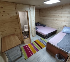 Пять отдельностоящих кроватей. Отдельный душ в номере, отдельный санузел в номере. Отдельный вход с улицы. Холодильник, микроволновка