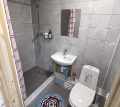 В номере: двуспальный диван, односпальная кровать, постельные комплекты, 2 розетки в номере, теплый пол, окно, стол, этажерка, обогреватель, Wi-Fi. В ваннойкомнате: раковина, душевая в кафеле, зеркало, полотенце, туалетная бумага, освежитель воздуха, мыло.