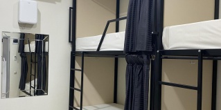 Номер состоит из трех двухъярусных кроватей с шторкой ,полоской . светильником и розеткой , шкафчиком для каждой кровати. Зеркало в пол .