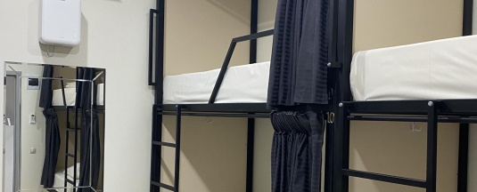 Номер состоит из 4 двухъярусных кроватей с шторкой ,полоской . светильником и розеткой , шкафчиком для каждой кровати. Зеркало в пол .