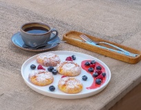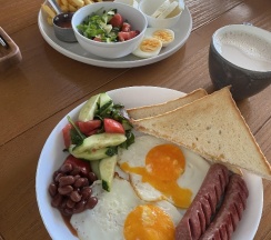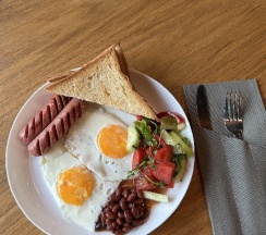 2. Завтрак это одно блюдо, которое ты выбираешь из меню за один день до и черный кофе/чай, все по 1й порции. И еще сообщаешь ко скольки, чуть опрздал -все остынет. Завтрак то вкусный, но было бы супер, чтобы хотя бы был маленький стол с минимумом в виде воды, сливок для кофе, печенья/конфет, если совсем супер то фруктов. Но ничего нет. Не надо прям шведский стол, но что-то доп.