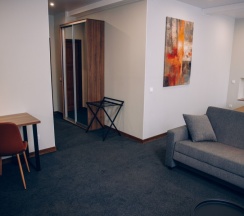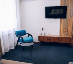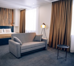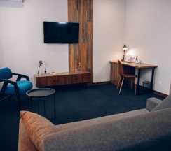 Студийное пространство номера общей площадью 33 кв. м. объединяет спальню и гостиную с рабочей зоной. Комфортная обстановка номера прекрасно подойдёт для взыскательных гостей и путешественников с детьми. Номер выполнен в современном стиле в спокойной природной сине-серой гамме.