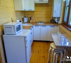 Кухня: кухонный стол на 4 места, набор посуды, чайник, мини холодильник.