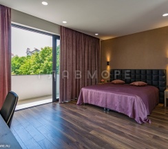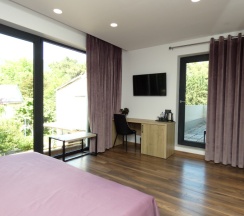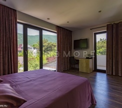 Комфортабельный номер с удобной двухспальной кроватью, двумя прикроватными тумбочками, оборудованным рабочим местом, просторной ванной комнатой с окном, меблированной лоджией, современным телевизором, бесплатным Wi-Fi, холодильником, набором для чая. В ванной комнате: ванна с тропическим душем или душ, санузел, умывальник, фен, комплект полотенец (в том числе пляжные), халат, тапочки, фен, косметические принадлежности. Панорамные окна номера открывают вид на горы, море и пансионат.