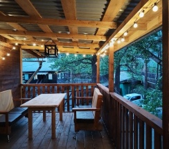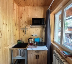 Прекрасное место для отдыха. Вдали от шумных улиц. Уютное продуманное пространство. Прекрасные номера. Отдельное спасибо за красивую веранду, на которой можно выпить кофе и послушать шум ручейка. Есть банька и чан. Я бы ещё сделала ширму, которая закрывает чан от двора.