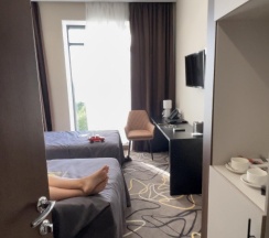 Бронировали самый простой номер с 2мя кроватями без завтраков - кровати 1 спальные (узкие). В номере холодильник, чайник (при уборке ежедневно ставят воду, пополняют чай/кофе), фен