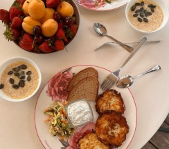 ☕️ Утро начинается с вкусного и полезного завтрака с видом на лес и реку — овсянка, деруны, свежие ягоды.