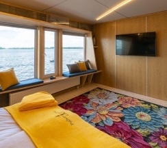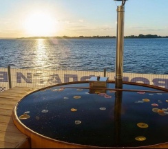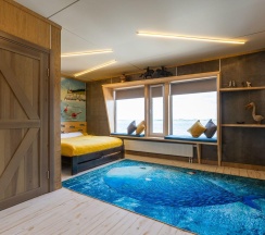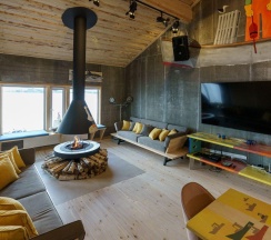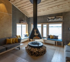 Коттедж оснащен дизайнерским интерьером. Для гостей доступна рыбалка с пирса, банный комплекс, экскурсии и персональное меню.