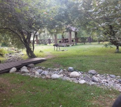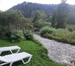 Сама база классная, территория красивая зелёная, вид живописный, вдали от трассы, кафе и магазинов. Приятно посидеть на крыльце домика с красивым видом, беседки на берегу речки. На территории есть батут для детей, хороший бассейн с лежаками, кухня общая очень приличная, чистая, есть все необходимое, правда вилочки всего 2 шт. Звезду убирать не буду, потому что в целом понравилось. Но.. минусы все-таки есть: домик рассчитан на 2взрослых (причём маленького роста, кровать маловата) и 2 детей. Также хотелось бы ДО заселения больше информации по ценам, кафе, правилам проживания (сайта нет, в 2гис тоже информации нет, а обращаться по каждому вопросу не хочется). Сделайте нормальный прайс со всеми нюансами, чтобы при заселении не было неприятных сюрпризов.