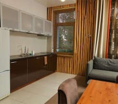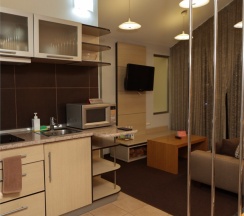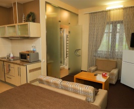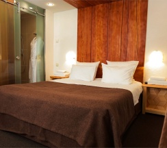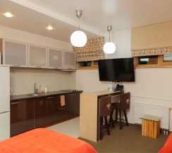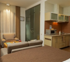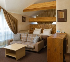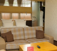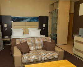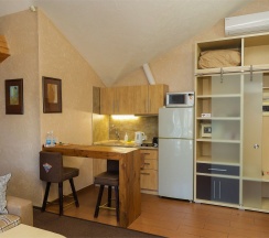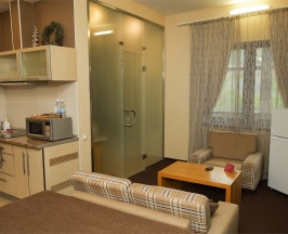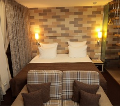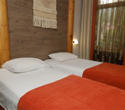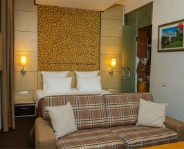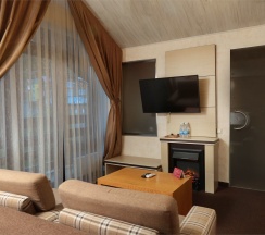 Уютный однокомнатный номер улучшенной категории, площадью 34,2 м², рассчитан на проживание 2-3х гостей: 2 человека на основных местах (двуспальная кровать), дополнительное место (евро раскладушка).