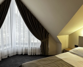 Номера категории Люкс представляют собой просторную комнату на мансардном этаже, с большой зоной отдыха и большим санузлом.