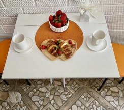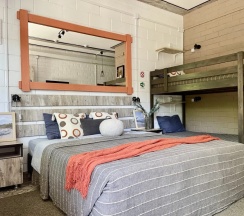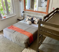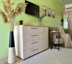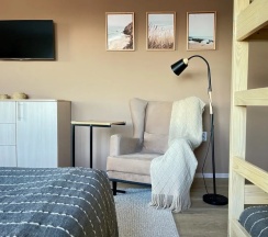 Проживали с двумя детьми (4г. и 2г.) в период с 27.06 по 06.07.25 на втором этаже в самом последнем номере. Номер очень уютный, сделан со вкусом и оснащен всем, чем только можно. Кухня небольшая, но вмещает в себя эл.плиту, чайник, свч, мультиварку, холодильник, набор посуды от кастрюлей до венчика и салфетницы. В номере так же есть кондиционер, утюг с гладильной доской, фен, небольшая навесная стиральная машина (это просто бомба) и даже порошок к ней. Кровать у нас была одна двухспальная и двухъярусная для деток. Матрацы очень удобные, все высыпались, было комфортно.