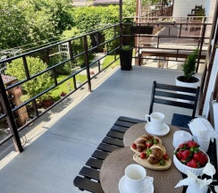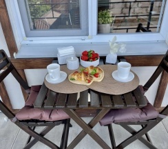 Красивый, удобный, оформленный с вниманием к мелочами и с любовью номер, удобный для семьи с 2 детьми. Впечатление, что над номером поработали дизайнеры. Посуда - не просто какая-нибудь для галочки, а действительно всё, что нужно: кастрюля нержавейка, сковорода, 4 тарелки, 4 чашки, 4 стакана, 2 бокала, 2 рюмки, хорошие ножи, 4 вилки, 4 столовых ложки, 4 чайных ложки и т.д. На веранде перед каждым номером красивые деревянные столик и 2 стула, сушилка. Стиральная машина в ванной и даже положили порошок. Хорошая детская площадка в тени, мангальная и столики во дворе.