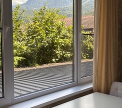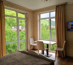 Случайно нашли этот гостевой дом. Брали трёхместный номер на 3 этаже.вид на горы это прекрасно. Матрасы удобные, постельное бельё белоснежное, полотенца чистые. Есть всё что надо: кондиционер, чайник, телевизор, холодильник, хороший фен, вместительный шкаф, удобный семейный столик с панорамным видом, и главное не душ, а удобная ванная. Хозяин молодец, следит за порядком как пионер вожатый, чтоб гости сильно не разгуливались)))