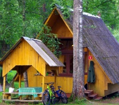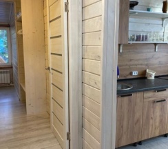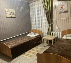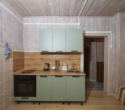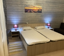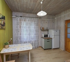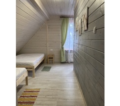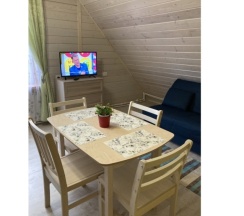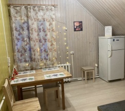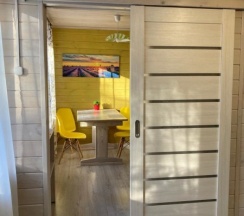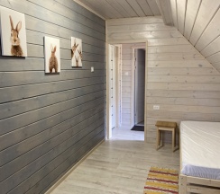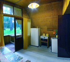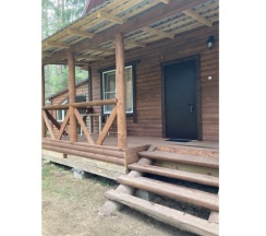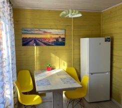 Домик для проживания до четырех гостей. Он оснащен двумя спальнями, в каждой по две односпальной кровати. Есть обеденная зона, холодильник, газовая плита, кухонные принадлежности. Около домика своя беседка. Санузел, душ в отдельностоящем здании. Возможно проживание с домашними животными.В непосредственной близости от домиков находятся зоны с летним водопроводом, где можно умыться, и помыть посуду. Возможно предоставления дополнительного места( раскладушка или детская кроватка) за дополнительную плату.