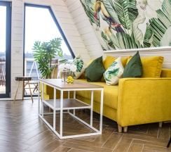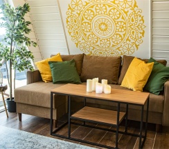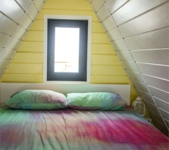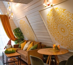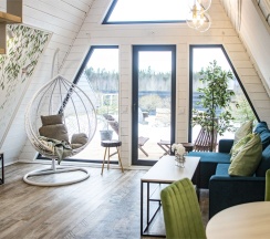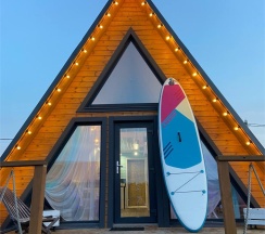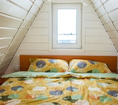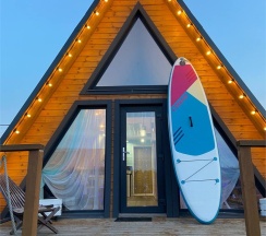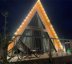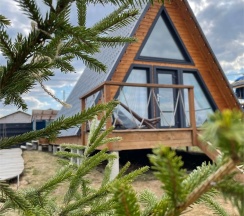 Коттедж "Лето" - новый 4-хместный дизайнерский коттедж(А-frame), оформленный в летних цветовых тонах с двухспальной кроватью и раскладным диваном. Бесплатная парковка, Wi-fi, беседки для барбекю.