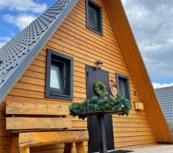 Коттедж "Зима" - новый 4-хместный дизайнерский коттедж(А-frame), оформленный в бирюзовых тонах с двухспальной кроватью и раскладным диваном. Бесплатная парковка, Wi-fi, беседки для барбекю.