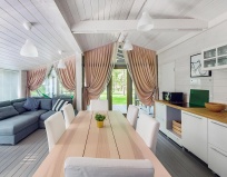 3. Домик 100м, фото все соответствуют. Домики новые, чистые, свежие, большая кухня, диван, стол на 6-8 человек, печка, на улице гамак, шезлонг, барбикьюшница-яйцо. 2 спальни с удобными кроватями.