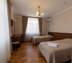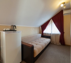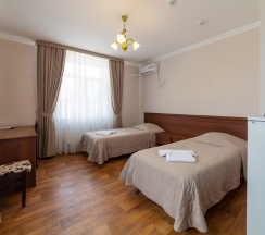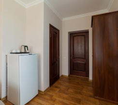 Теплые, уютные однокомнатные номера 20 кв.м. оснащены: двумя раздельными односпальными кроватями/одной двуспальной кроватью и раскладным кресло-кроватью/диваном (уточняйте у менеджера при бронировании), зеркалом, столом, стульями, прикроватными тумбочками и холодильником. Санузел с душем, феном, комплектом банных полотенец на каждого. Комплексный завтрак включен в стоимость (не шведский стол). Кулер с горячей/холодной водой и гладильная доска с утюгом на 1ом этаже в каждом корпусе.