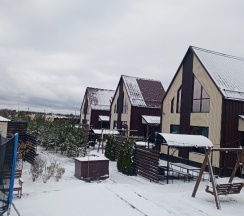 Территория домиков в процессе облагорожения, посажены деревья и газон, который пока не везде взошёл, но это временно. Очень удобные дорожки сделаны, не надо ходить по грязи, если будет плохая погода.
