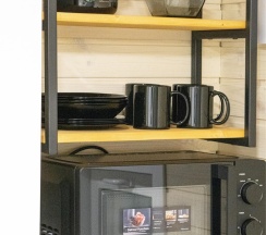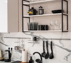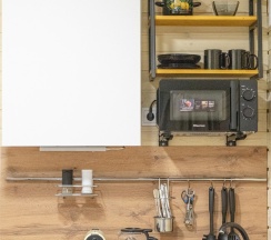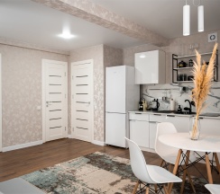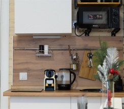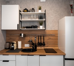 Укомплектованная кухня - холодильник, чайник, кофемашина и прочая необходимая кухонная утварь.