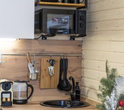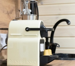 Укомплектованная кухня: мини-холодильник, чайник, кофемашина и прочая необходимая кухонная утварь.